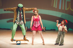 No fundo do cenário, uma projeção de lona de circo e alguns